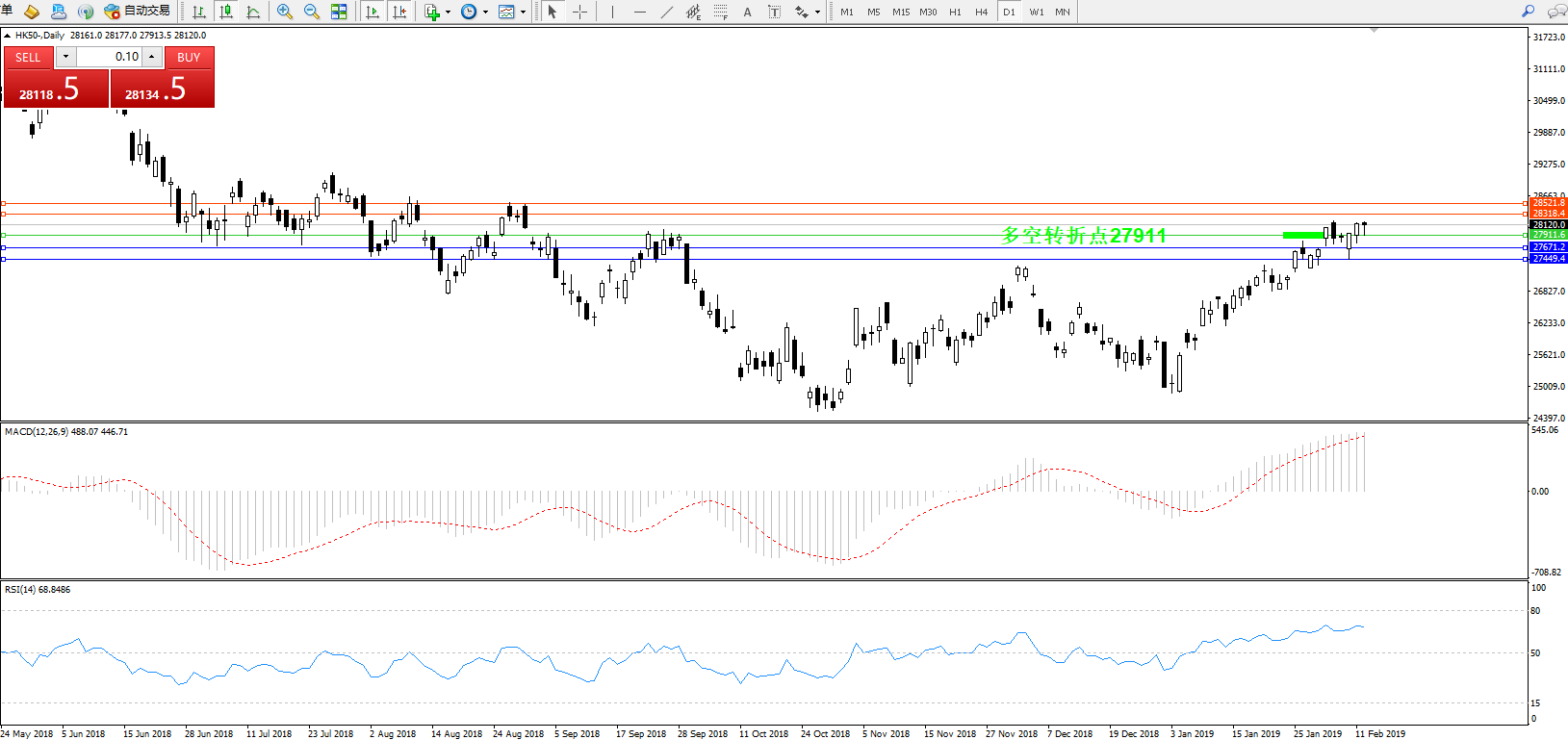 交易策略:27911上方看涨,目标28318、28521