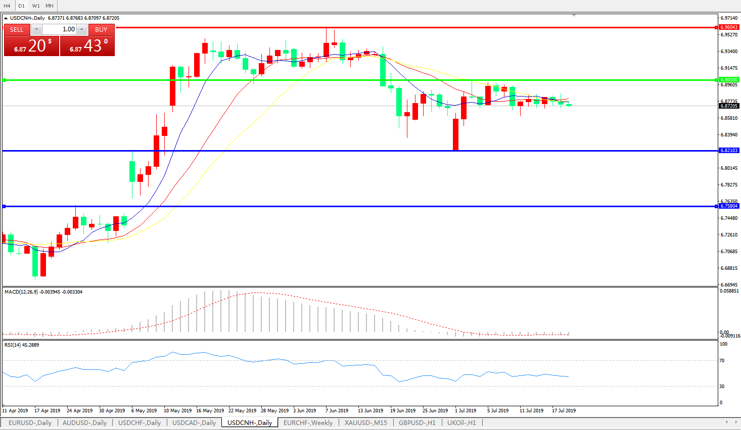 技术面简析:日图均线继续粘合无方向,MACD徘徊在0轴附近且动能柱若隐若现,RSI趋于走平,预计短期汇价将继续整理或向下修正,中期关注6.9010附近多空转折区域压制是否有效及中美贸易谈判最新进展。