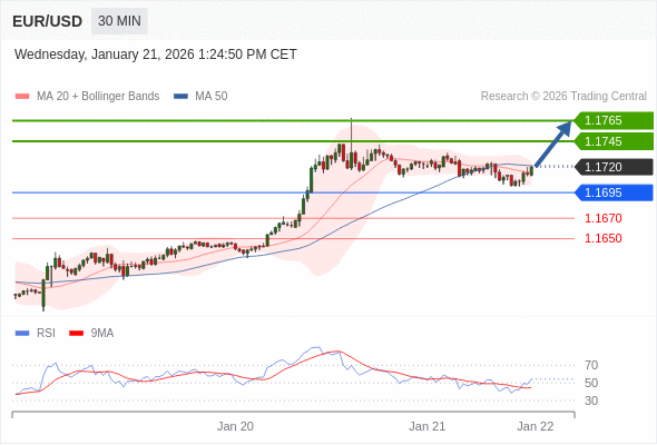 欧元/美元 当日内: 在1.1695之上,看涨。