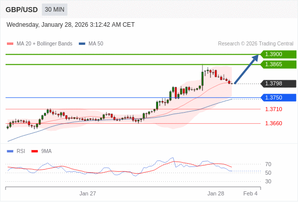 在 1.3750 之上,看涨,目标价位为 1.3865 ,然后为 1.3900 。