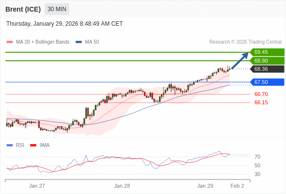 在 67.50 之上,看涨,目标价位为 68.90 ,然后为 69.45 。
