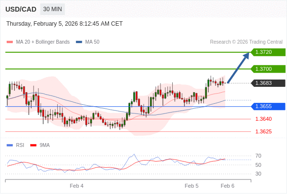 在 1.3655 之上,看涨,目标价位为 1.3700 ,然后为 1.3720 。
