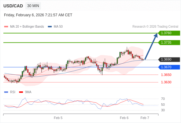 在 1.3670 之上,看涨,目标价位为 1.3735 ,然后为 1.3760 。