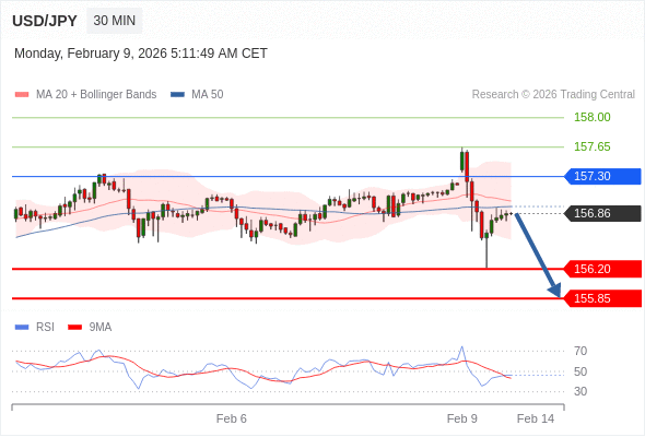 在 157.30 之下,看跌,目标价位为 156.20 ,然后为 155.85 。