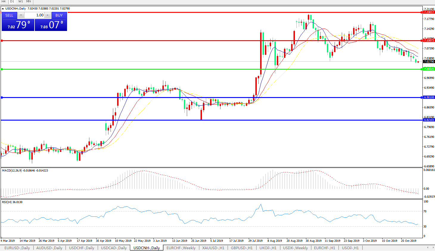 备选策略: 在7.0000之下,看跌,目标价位为6.9010,然后为6.8210。