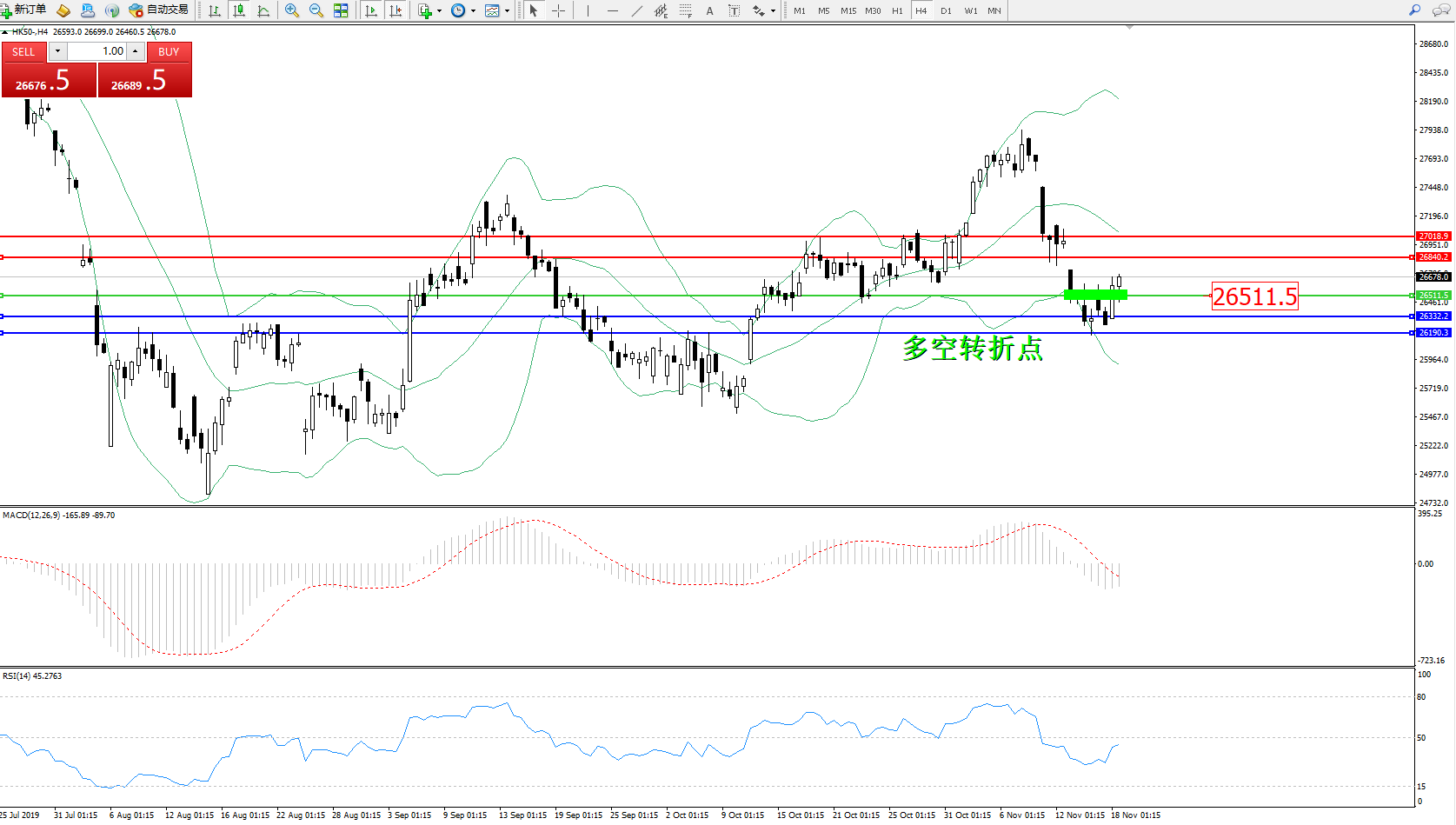 香港恒生指数11月18日(周一)收盘上涨354.43点,涨幅1.35%,报26681.09点;港股早上高开115点后再延续升,恒指高见26688。上周恒指继续向下调整,而受多项利空因素持续影响,整体处于较为弱势的状态。但相比于上周其它四个交易日而言,上周五恒指走势则偏稳一些。当前这个点位可以说是形成了一个短期的心理关口。中美有望达成贸易协议,美国10月份零售销售涨0.3%好于预期,投资者入市态度趋于乐观。
