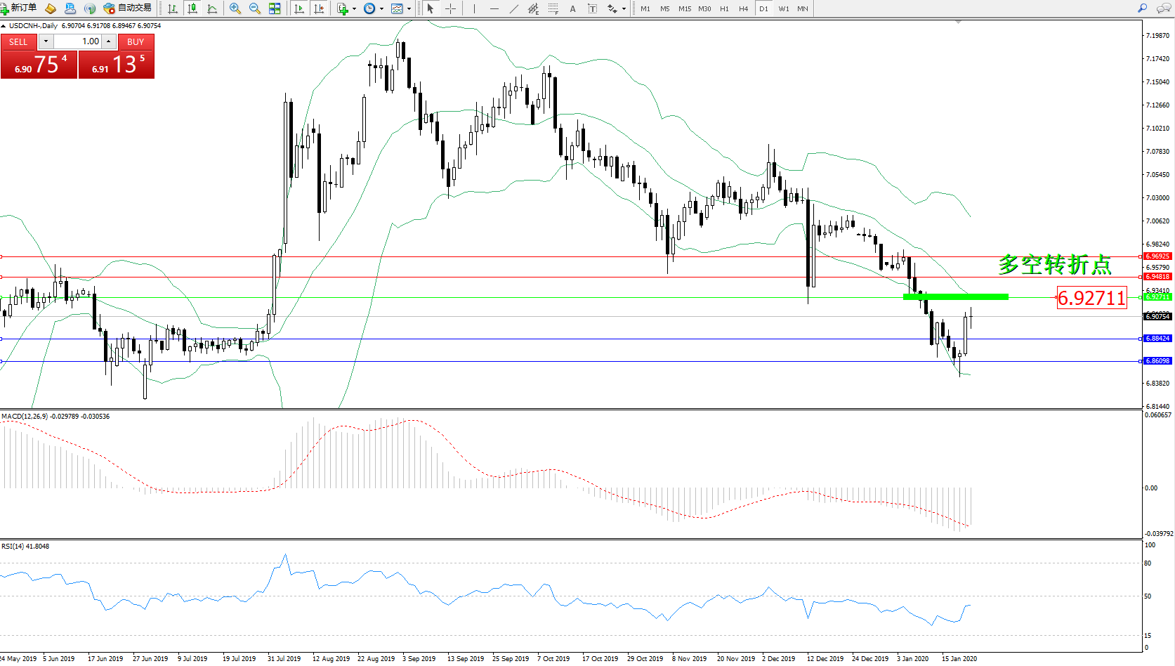 交易策略:6.92711下方看跌,目标6.68424、6.86098