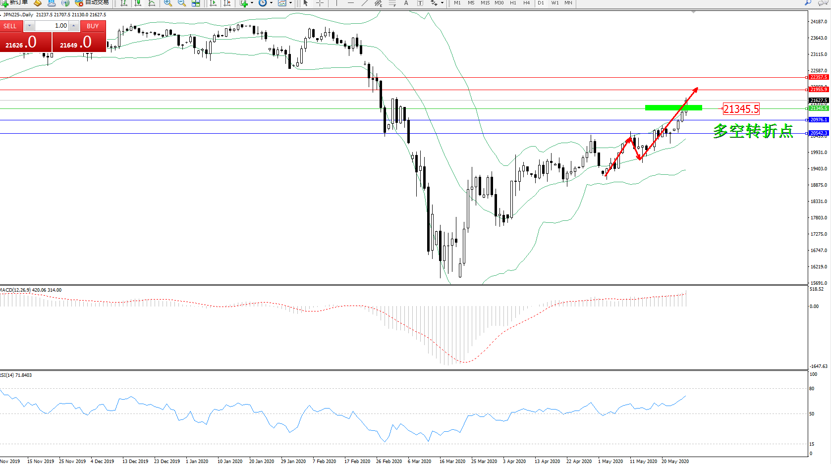 日经225指数5月27日(周三)收盘上涨168.83点,涨幅0.79%,报21440.00点。市场对国际关系趋于紧张感到担忧,日本将编制一份规模1.1万亿美元的新刺激计划,其中将包括相当大规模的直接支出,以缓和新冠疫情对经济的打击;这项刺激计划的部分资金将由政府的第二份追加预算提供,它是上个月政府推出的1.1万亿美元刺激方案之外的一份新计划,至此日本政府的抗疫支出总规模达到234万亿日元,约相当于日本国内生产总值(GDP)的40%;日本首相安表示,面对未来的艰难道路,必须采取一切办法来保护企业和就业。还必须采取一切必要措施,为新一轮疫情做好准备。