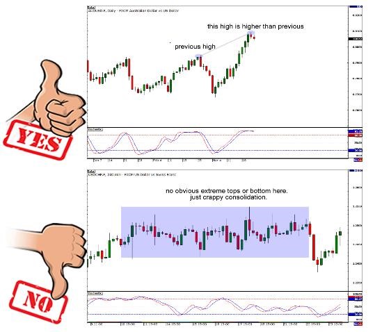 (图1的高点高于之前的高点,这时可以关注背离信号带来的交易机会;而图2明显处于震荡市场中,不适宜运用背离规则)