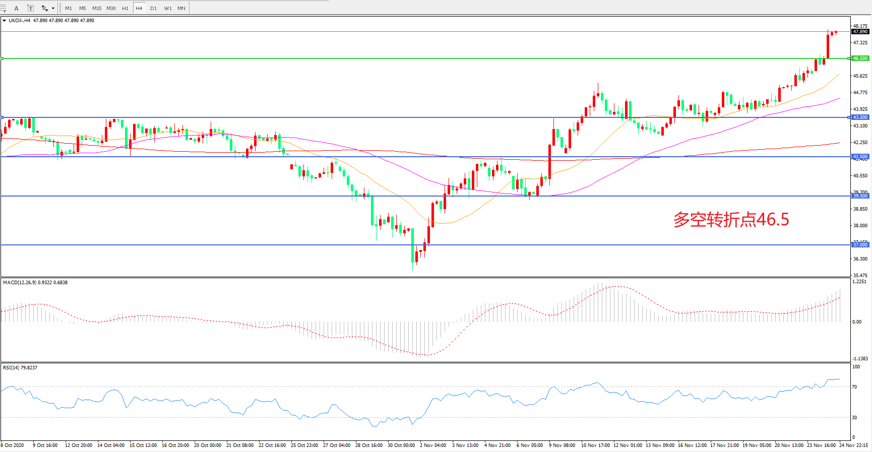 4小时图看,油价长阳拉升,突破前期整理区间,短期表现十分强势,46.5一线被成功突破,均线系统拐头向上,MACD红柱增加,RSI指标走平,日内震荡上行概率较大。
