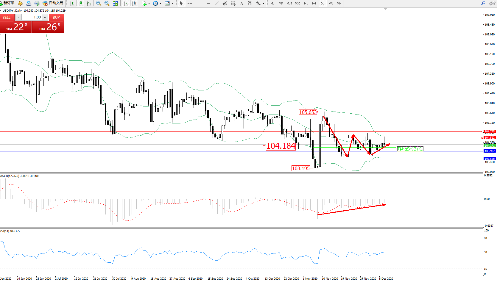 交易策略:104.184上方看涨,目标104.522、104.795