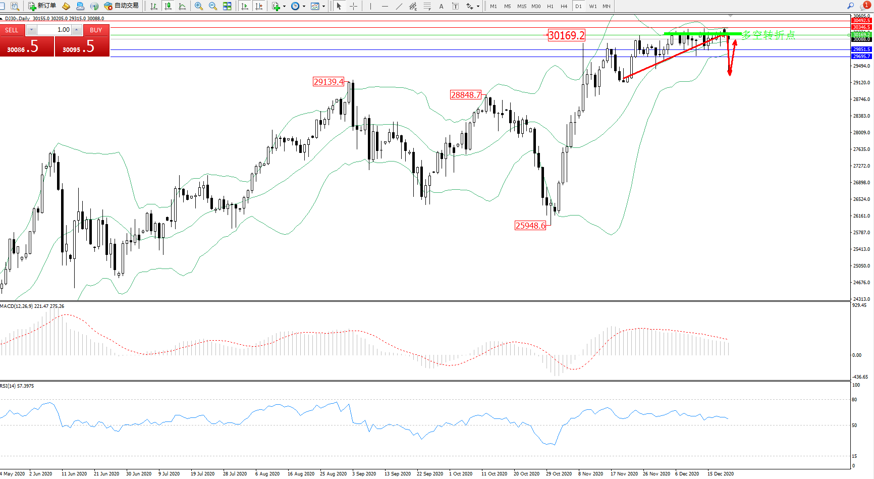 道琼斯指数指数12月21日(周一) 收盘上涨37.40点,涨幅0.12%,报30216.45点;美股三大指数收盘涨跌不一,道琼斯工业平均指数小幅上涨,高盛在监管机构批准股票回购后上涨。财政刺激进展对市场的影响力正在减弱,新冠疫情趋势现在主导市场走向,风险资产之前无视恶化的疫情趋势,如今显现一些脆弱的迹象。美元指数纽约尾盘上涨0.1%,接近盘中低点;早些时候,该指数曾升至91.022点的10日高点,一度上涨1.4%,创3月以来最大盘中涨幅。虽然美国抗疫救济法案以及新冠疫苗取得积极进展,但是英国出现的新冠病毒变异打击了市场风险偏好。美国众议院跨问题解决小组联合负责人Reed:问题解决者小组寻求更多刺激法案。