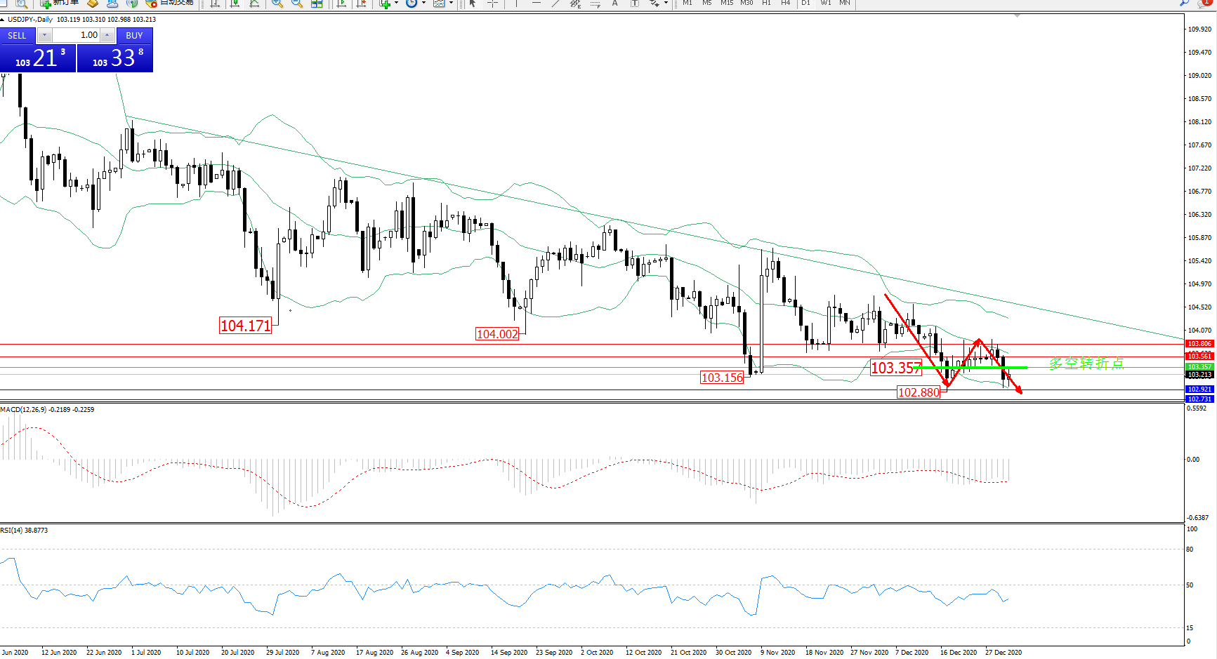 技术点评:空头动力延续布林带指标通道内中下轨区间持续震荡下行态势良好,底部抵达102.880位置后得到短暂支撑开始回升,但多头上扬动力欠缺,再度持续下行,纠结于布林带指标中下轨区间整理,布林带指标呈收口走势持续向下移动中,MACD指标处于0轴线下方空头区域维持整理平移中,RSI指标处于50均衡线下方空头区域维持窄幅整理有继续下移迹象;
