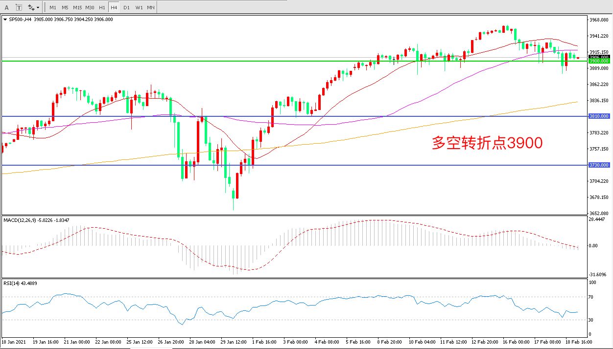 4小时图看,标普500延续高位震荡,整体波幅不大3900成为短期多空分水岭,均线系统逐渐走平MACD红柱缩短RSI指标走平,日内延续震荡概率较大。