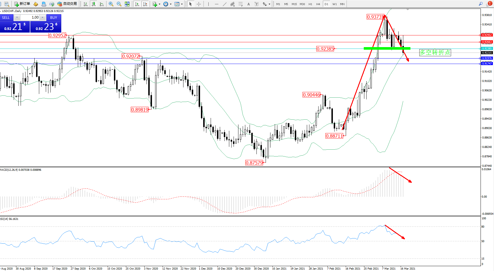 技术点评:多头动力延续布林带指标上轨附近节点持续震荡上扬,高位抵达0.93735附近后遇阻回撤,持续震荡触及布林带指标 中轨附近节点后开始整理,高位空头动力有继续下行态势,且跌势未见止步迹象,布林带指标呈收口走势持续中,MACD指标处于多头区域高位震荡缓慢回撤中,RSI指标处于多头区域持续震荡回撤向下移动中;