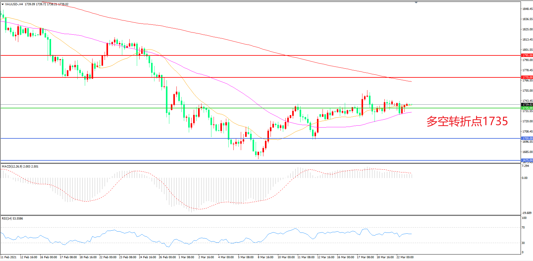 4小时图看,金价以21周期均线为依托展开整理,整体波幅较小,1735成为短期多空分水岭,形态上有形成头肩底的可能,MACD红柱缩短,RSI指标走平,日内延续震荡概率较大。