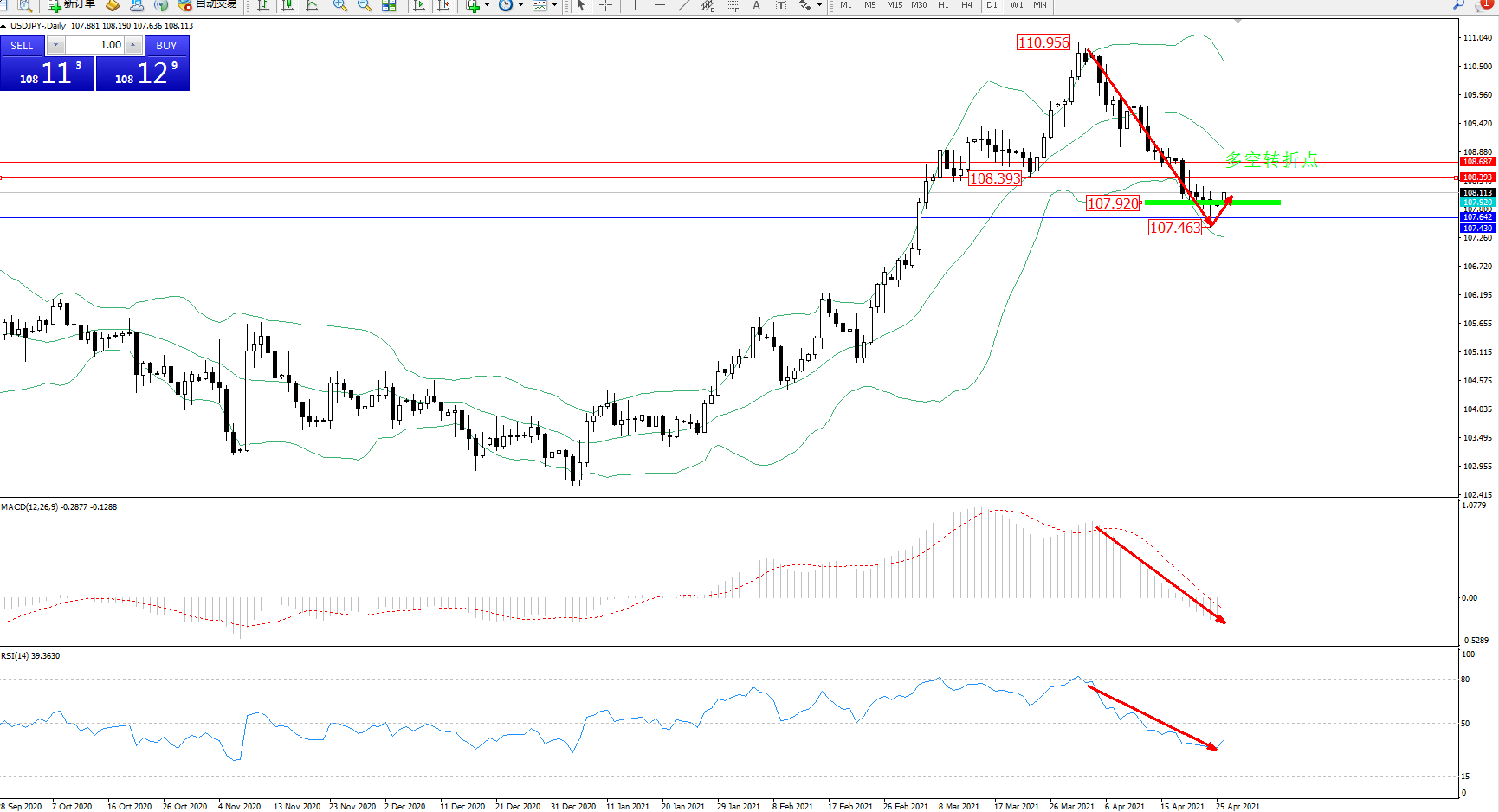 技术点评:高位空头动力延续空头下行走势持续下挫,触及布林带指标下轨附近节点后不断向下移动,空头动力下行至107.463附近得到支撑开始维持弱势整理,多头动力伺机入场有短期回升迹象,布林带指标呈张口走势后开始缓慢收口中,MACD指标高位空头动力持续下挫至0轴线附近节点,RSI指标高位空头动力跌势下行至50均衡线下方维持整理中;