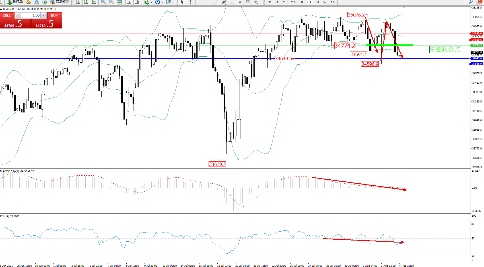 交易策略:34774下方看跌,目标34649、34596