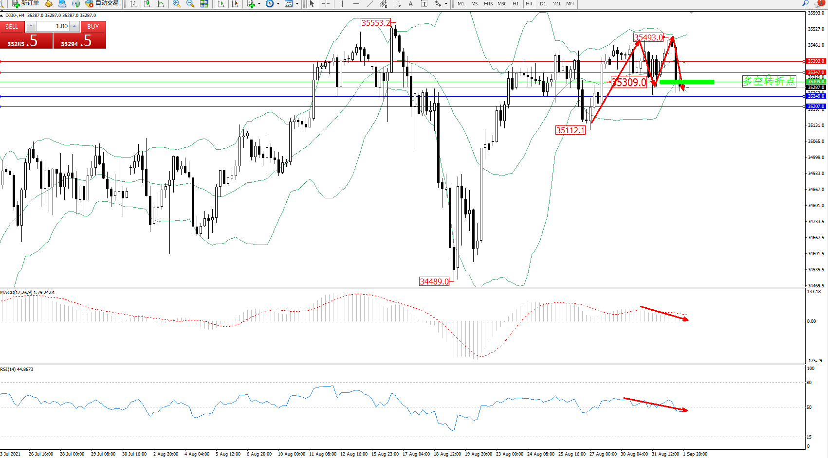 道琼斯指数DJ30——4小时K线图显示: