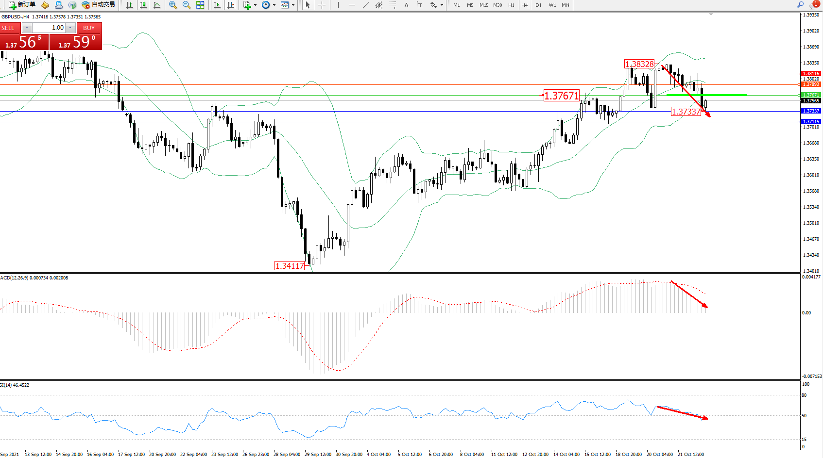 交易策略:1.37671下方看跌,目标1.37337、1.37115