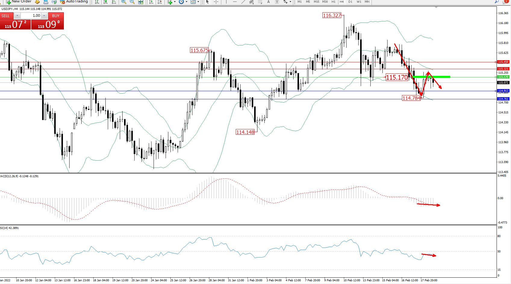 技术点评:空头动力延续布林带指标通道中下轨区间持续震荡向下移动,短期抵达114.784位置后得到支撑回升,但整体下行趋势态势良好,空头动力有继续下行态势,布林带指标呈收口不断向下移动,且空头动力不断下行中,MACD指标处于0轴线下方空头区域维持整理平移,RSI指标处于50均衡线下侧弱势徘徊中;