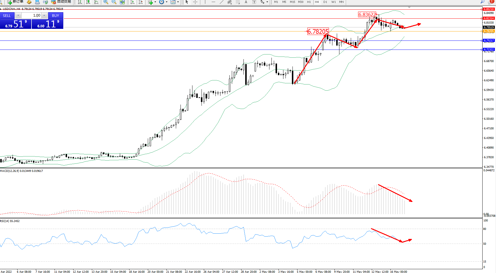 美元人民币USDCNH——4小时K线图显示: