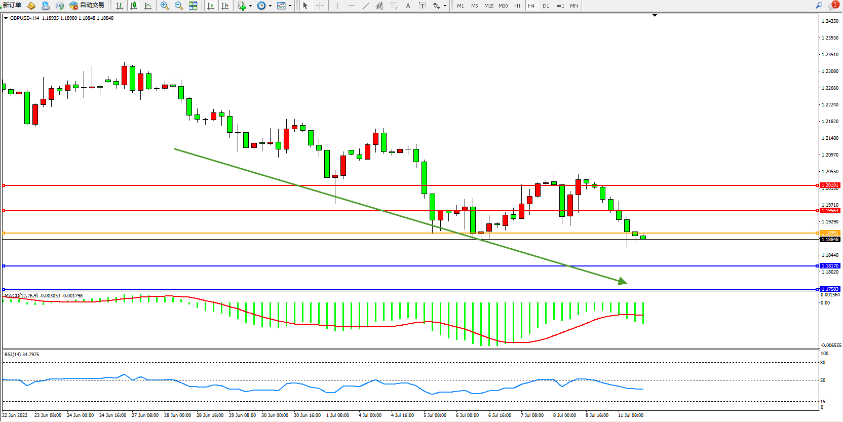 交易策略:1.18991下方看跌,目标1.18170、1.17583