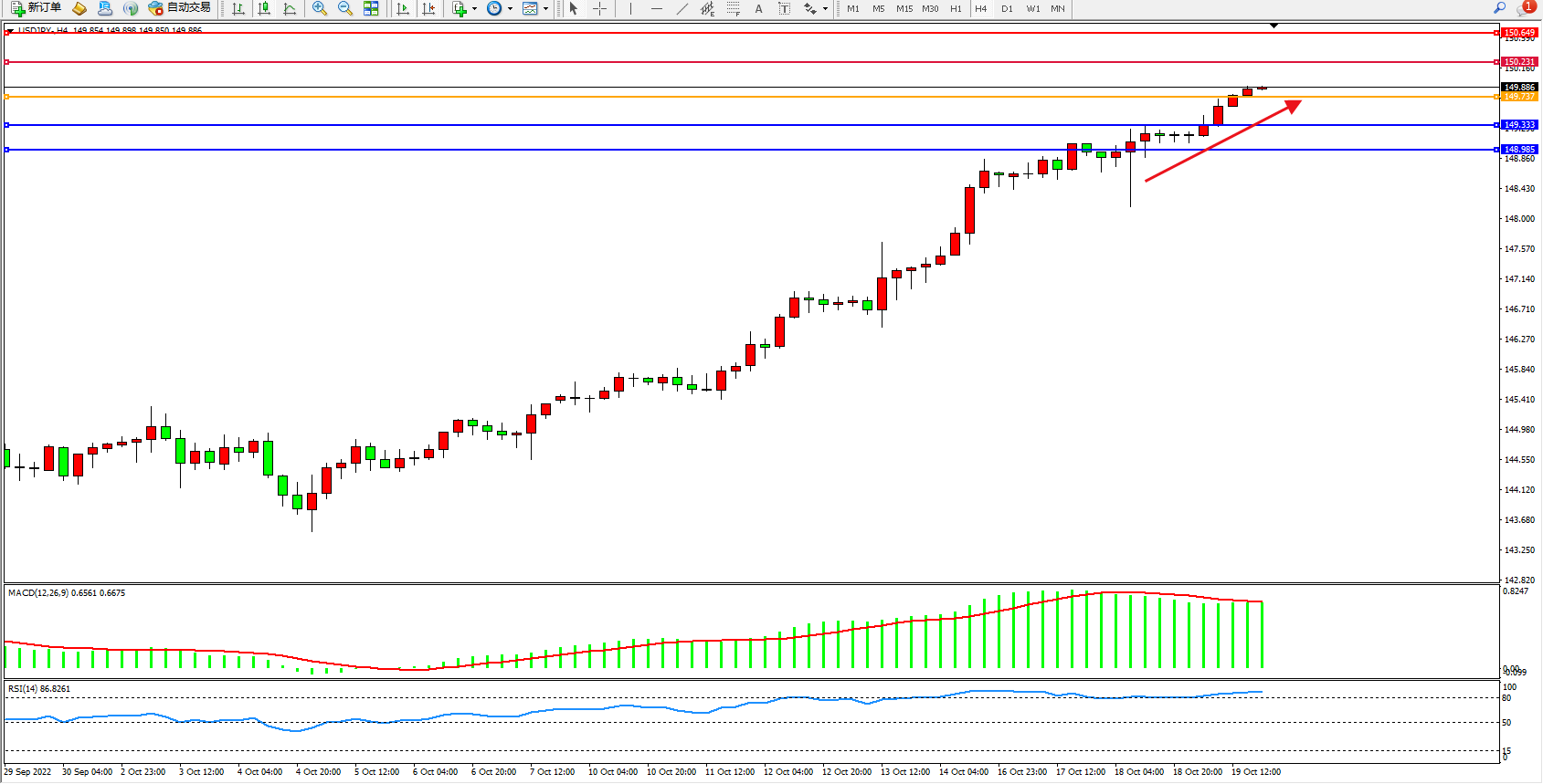 美元日圆USDJPY——4小时K线图显示: