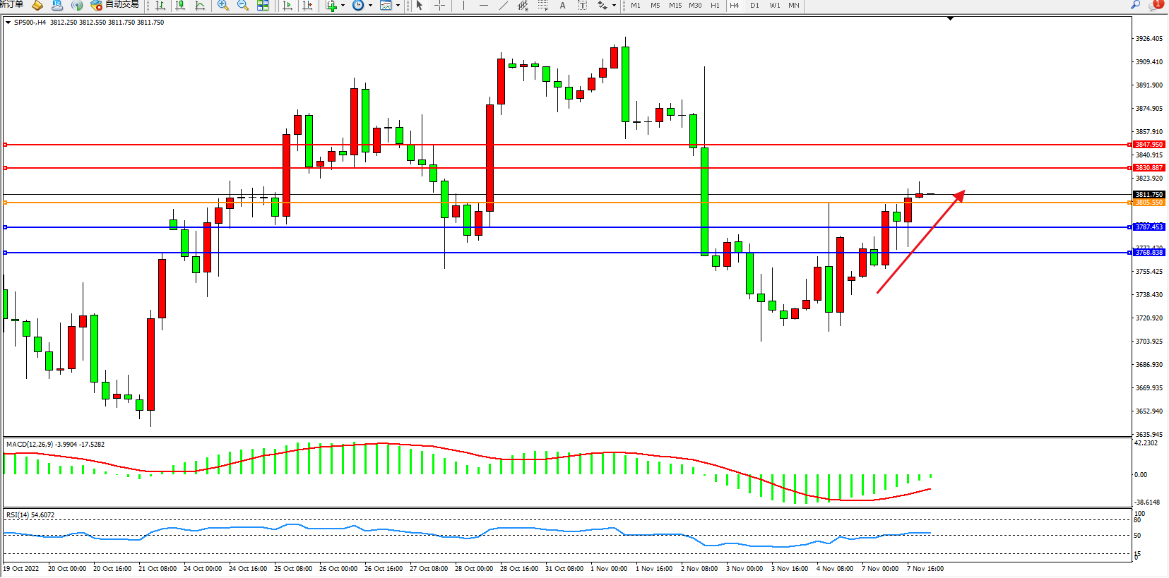 标普SP500——4小时K线图显示: