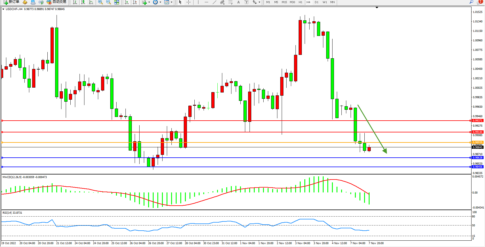 美元瑞郎USDCHF——4小时K线图显示: