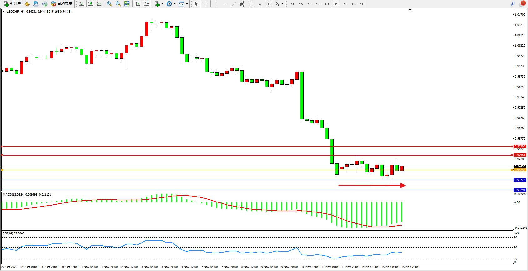 美元瑞郎USDCHF——4小时K线图显示: