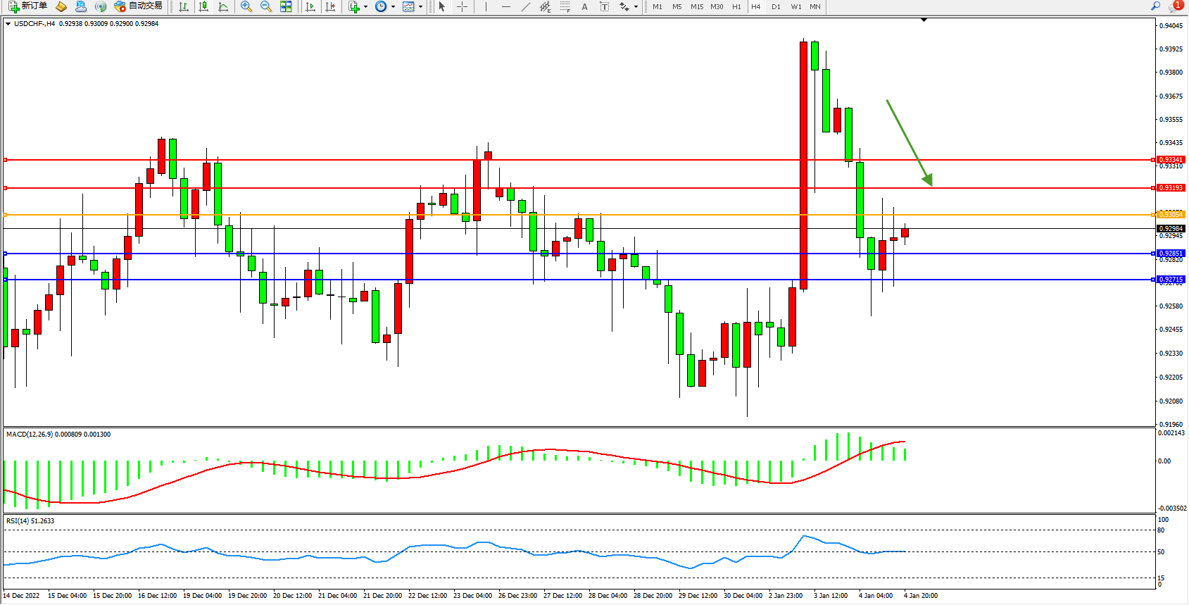 美元瑞郎USDCHF——4小时K线图显示: