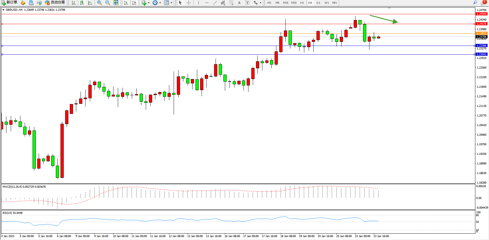 交易策略:1.23823下方看跌,目标1.23366、1.23042