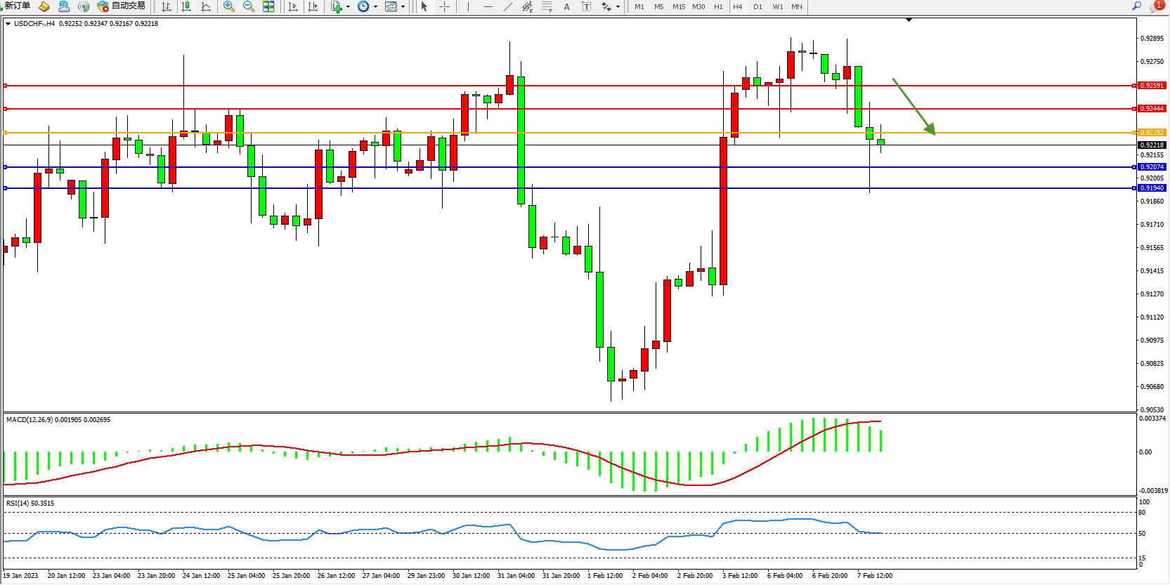 美元瑞郎USDCHF——4小时K线图显示: