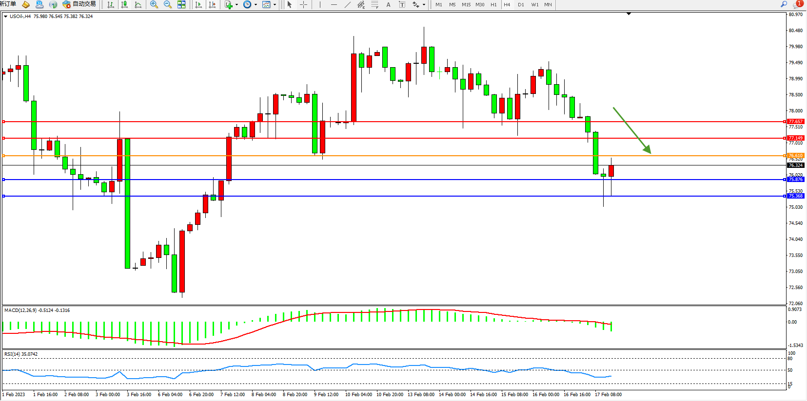 交易策略:76.610下方看跌,目标75.876、75.368