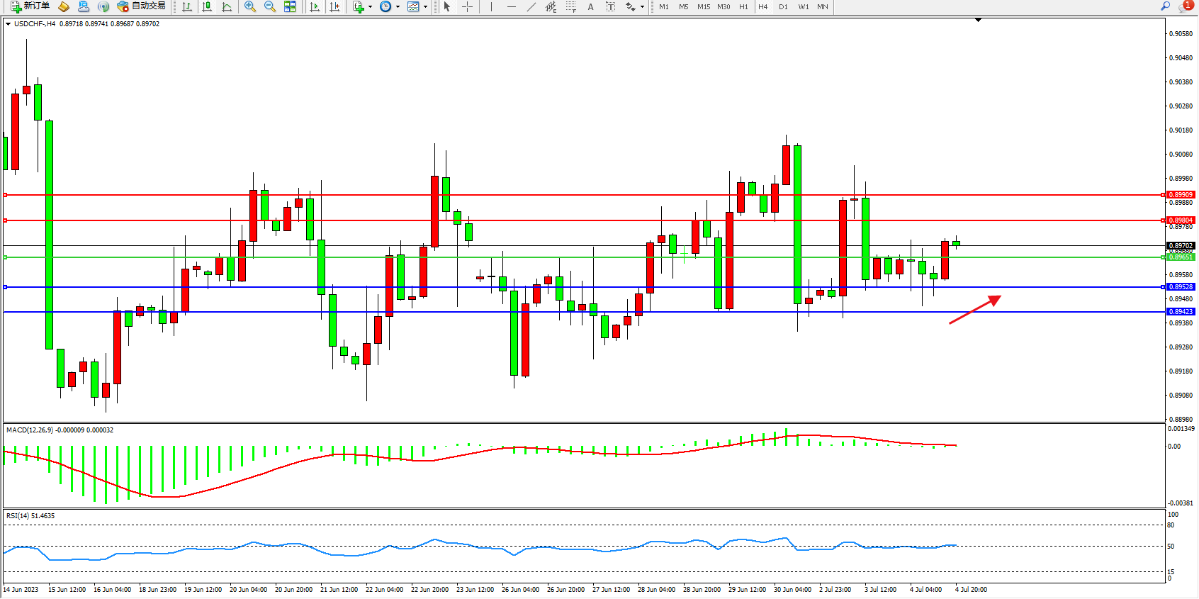 美元瑞郎USDCHF——4小时K线图显示: