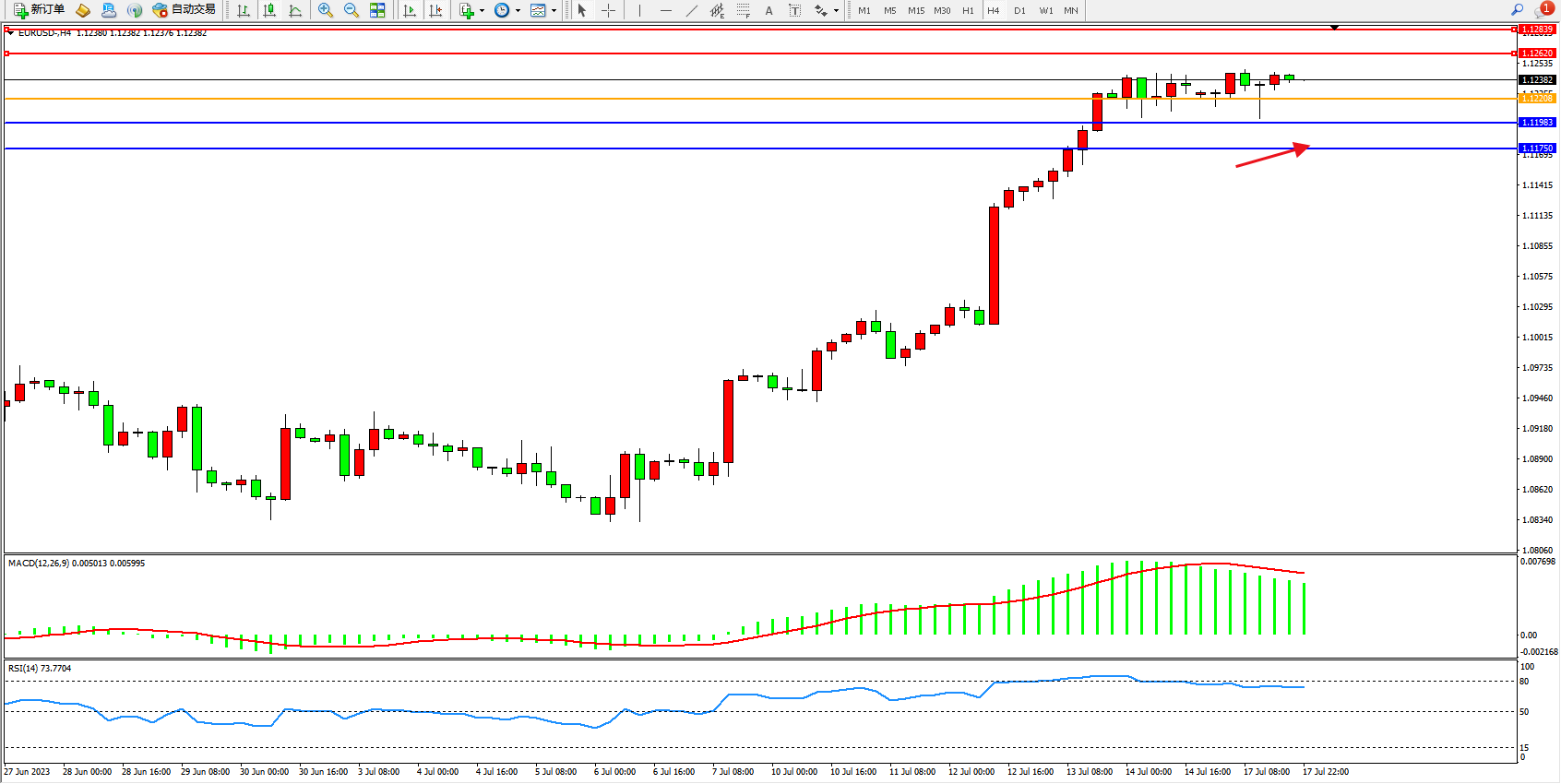 欧元美元EURUSD—4小时K线图显示: