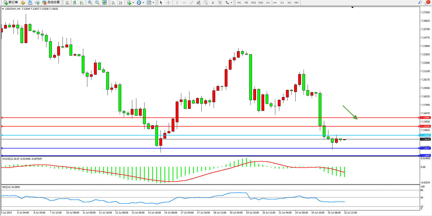 交易策略:7.14060下方看跌,目标7.12637 7.11800