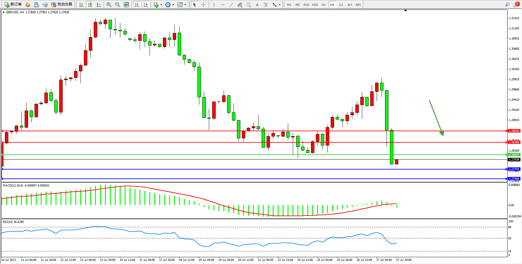交易策略:1.28057下方看跌,目标1.27701 1.27466