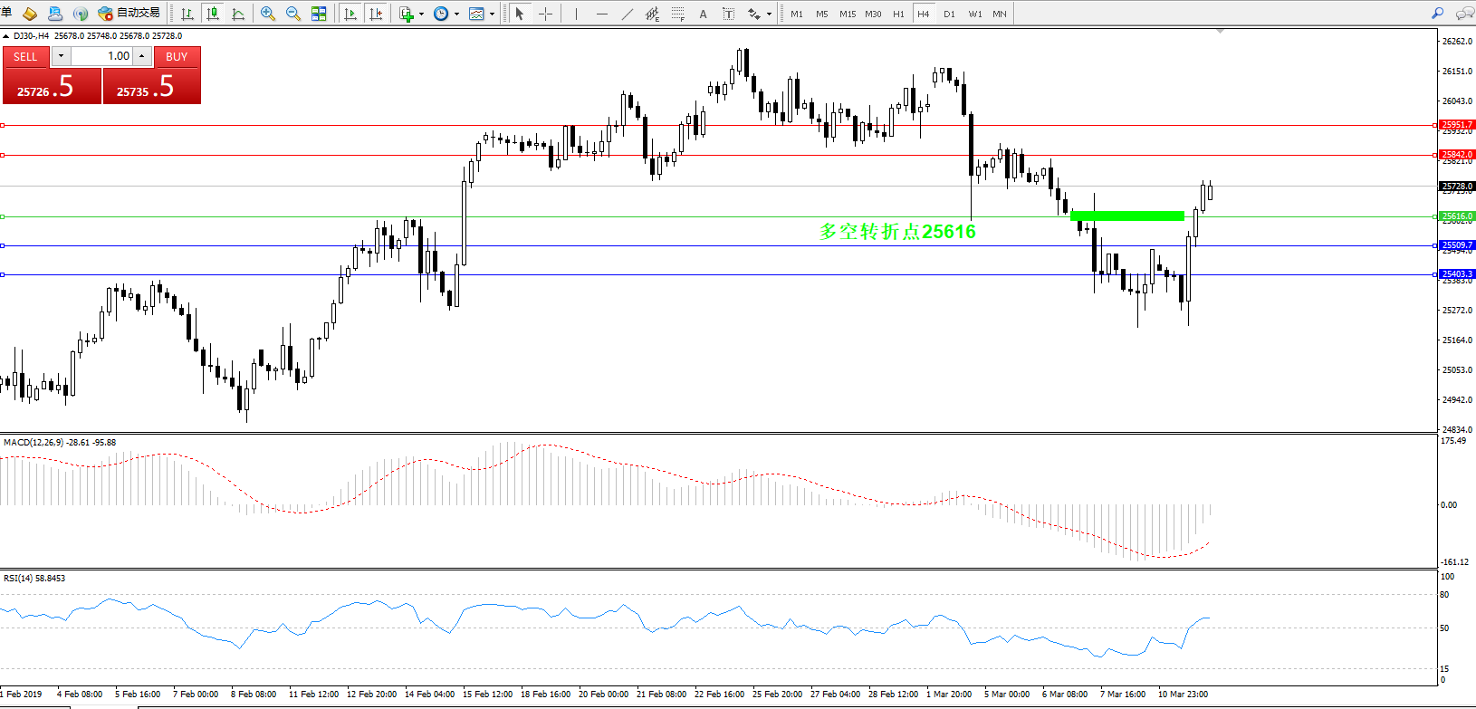 道琼斯指数DJ30—— 4小时K线图显示: