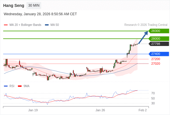在 27400 之上,看涨,目标价位为 28000 ,然后为 28300 。