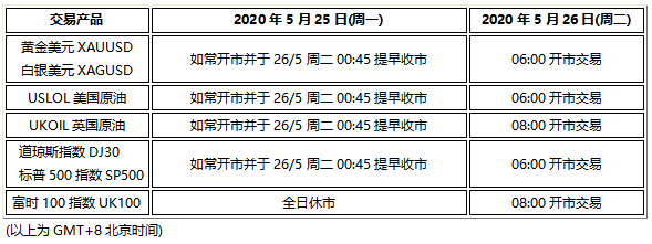 因应2020年5月25日(周一)为美国市场阵亡将士纪念日&英国市场春季银行假日,以下产品的交易时间将于假期期间提前或全日休市,敬请阁下知悉留意。