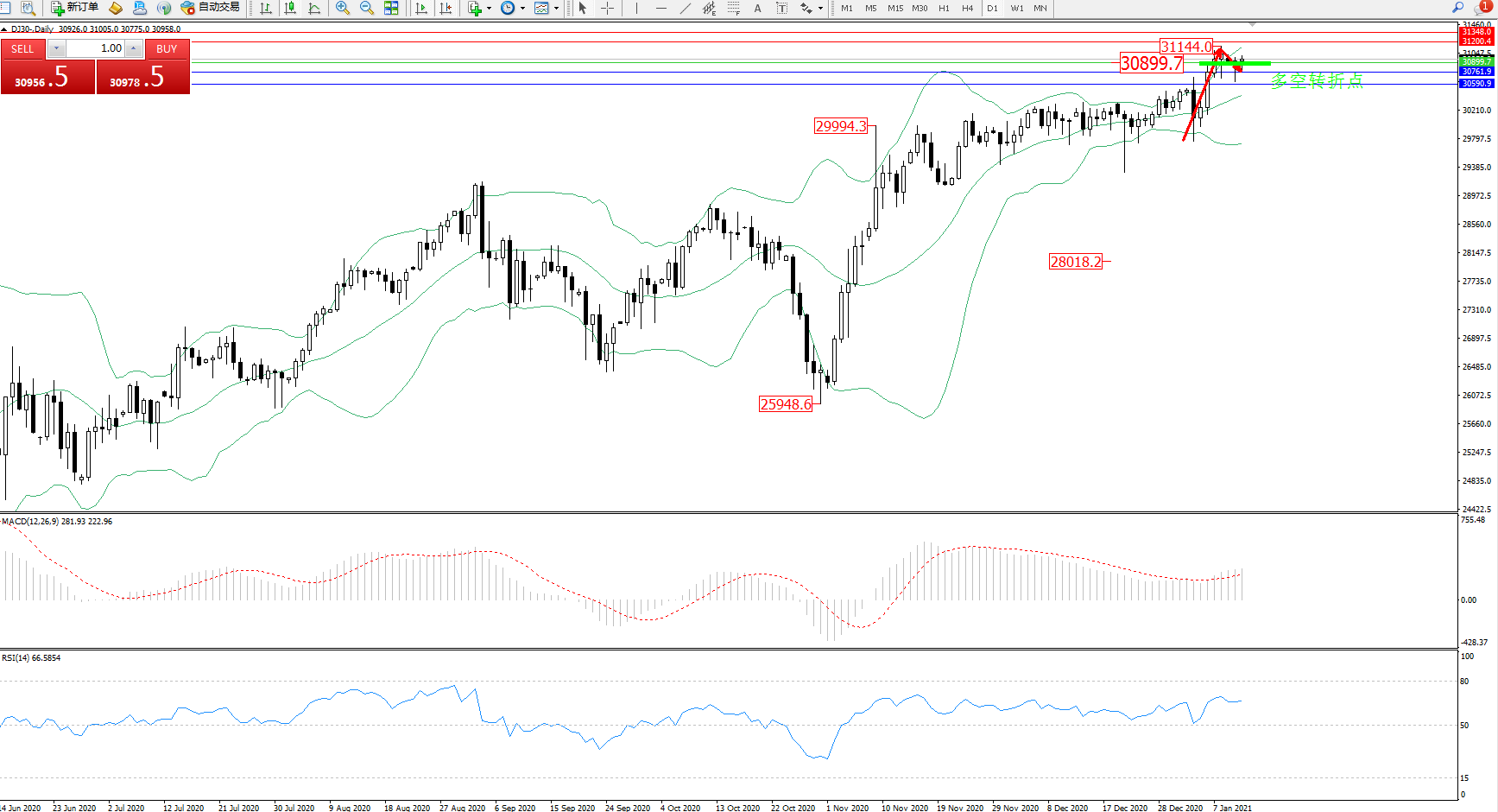 技术点评:多头动力延续布林带指标通道上轨附近弱势震荡向上移动中,高位抵达31144位置节点后出现整理回撤走势,布林带指标呈张口走势中,多头动力有继续拉升上扬态势,关注上轨附近关键节点,MACD指标处于0轴线上方多头区域维持整理平移后有向上移动迹象,RSI指标处于50均衡线上方多头区域维持震荡平移中;
