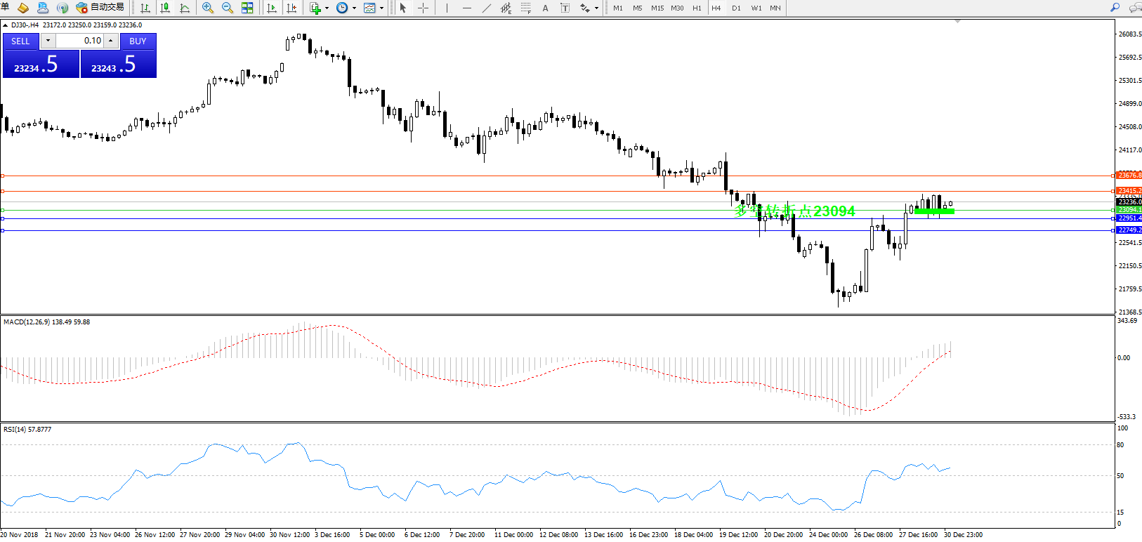 道琼斯指数DJ30—— 4小时K线图显示: